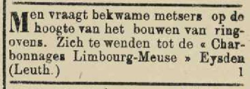 Oude kranten zijn een geweldige bron van informatie! In het Belang van Limburg van 22 februari 1913 stond een advertentie waarin de mijn van Eisden, de 'Maatschappij Limburg-Maas', op zoek is naar 'bekwame metsers op de hoogte van het bouwen van ringovens'.
